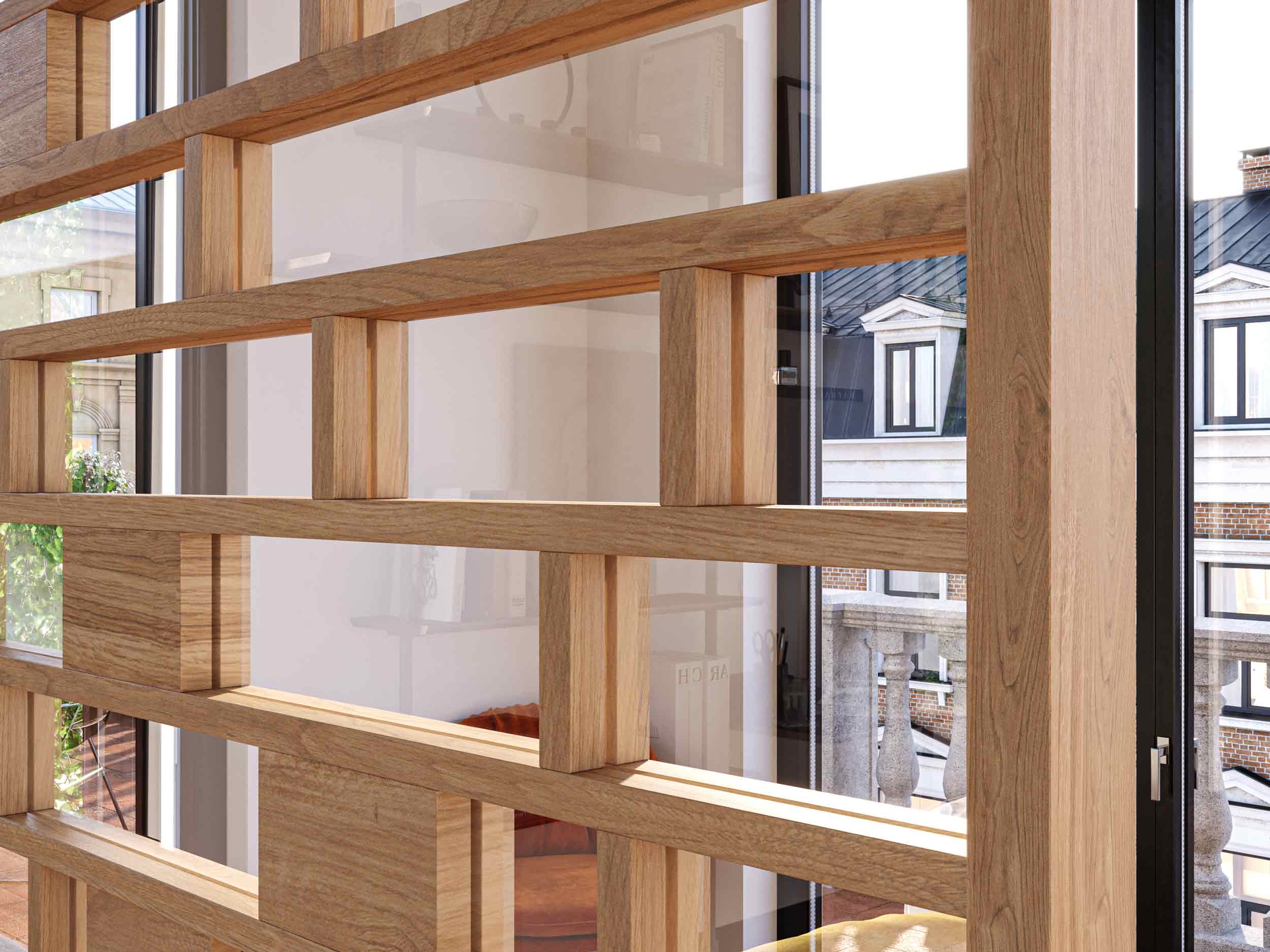 La tipologia con inglesine o a riquadri è quella che solitamente ritroviamo nei loft o in ambienti in stile industrial, grazie al suo disegno a griglia rigoroso ma a moduli custom. Le ante dotate di listelli in legno da 15 mm di spessore, disposte in verticale o in orizzontale, creano delle quinte in grado di cambiare la percezione dello spazio, frammentando la fonte luminosa in giochi di luce ed ombra dal forte impatto plastico. La lavorazione a listelli agisce sia da schermatura sia come elemento decorativo, una raffinata presenza grafica adatta a varie situazioni.