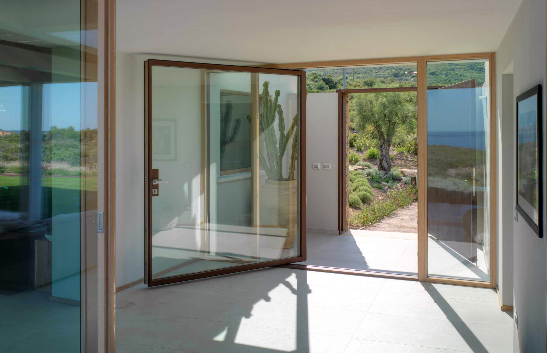 L’apertura a bilico rappresenta il serramento minimal per eccellenza. Dotato di apertura verso l’interno o verso l’esterno e di un sofisticato sistema di perni a scomparsa, il bilico verticale mostra il lato più elegante della collezione Skyline Minimal Frames.