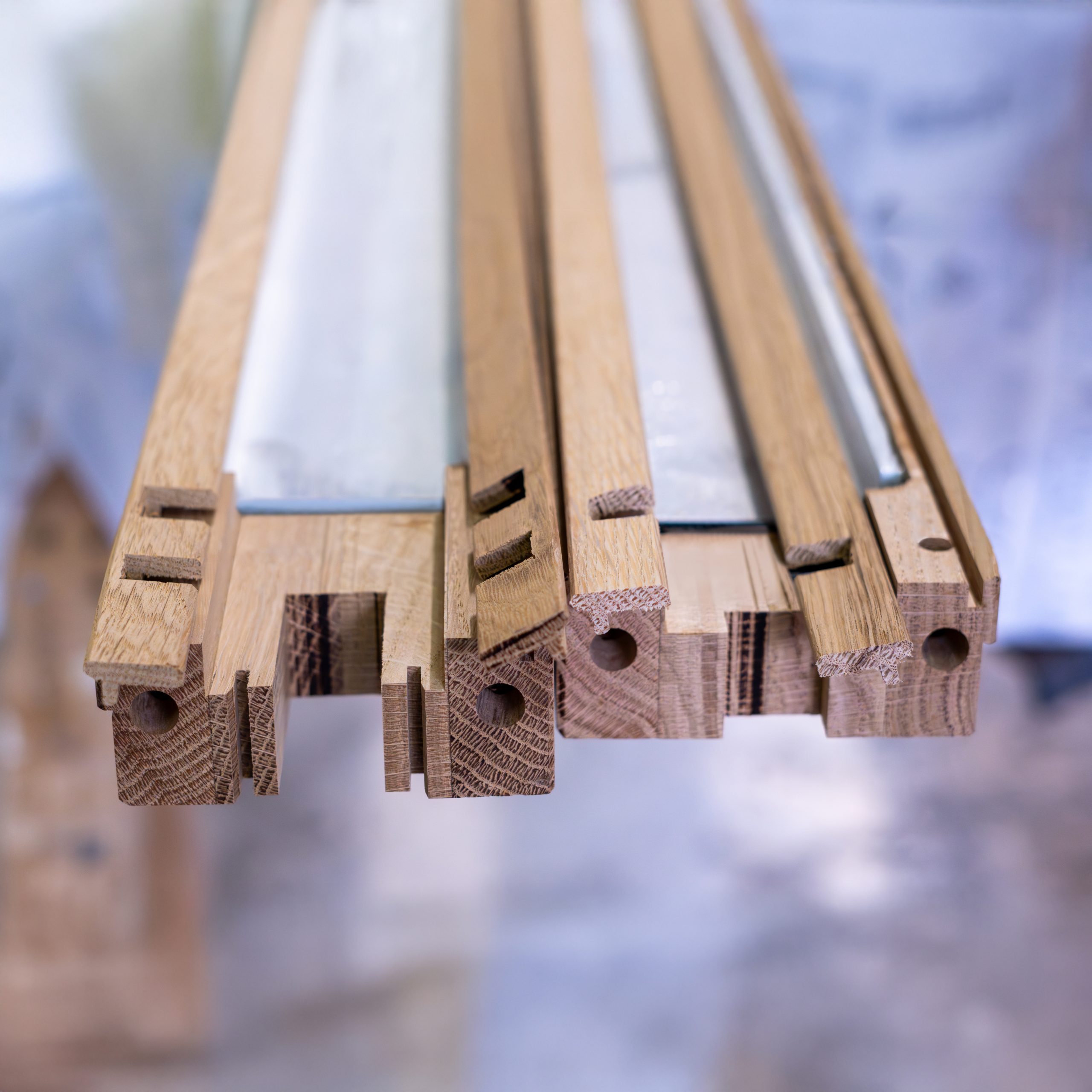 Il profilo in legno è stato sagomato per ospitare il rinforzo metallico, inserito e fissato mediante incollaggio strutturale, quindi ricoperto nuovamente dal legno. Anche il vetro e il montante in acciaio sono incollati tra loro con colle speciali, garantendo una fascia di tolleranza costante. Per assicurare una movimentazione sicura e una spinta adeguata, sono stati inoltre inseriti profili metallici a forma di pinna nel traverso superiore orizzontale, in modo tale da escludere la possibilità che l’anta possa uscire dai binari anche sotto forte sollecitazione.